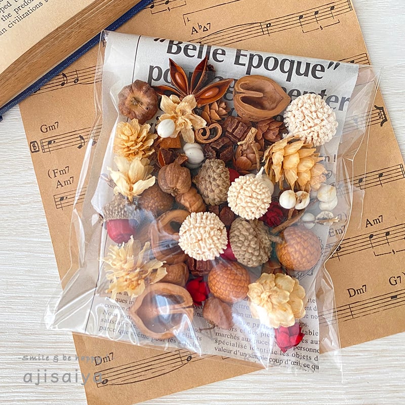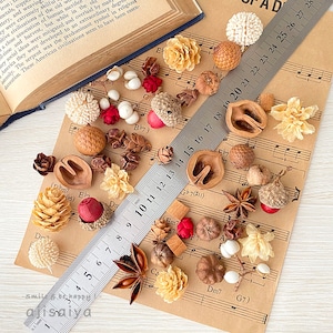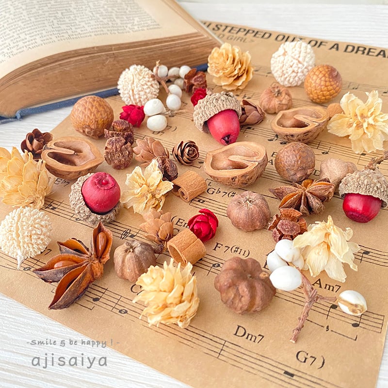 ナンキンハゼ、くるみ、ひのきの実、プッカポッド、タマラックコーン、ムタンバナッツ、カラーどんぐり、ミニツガ、シナモン、グイの実、スターアニス、パームベリーと、普段見かけない面白いかたちの木の実たち。