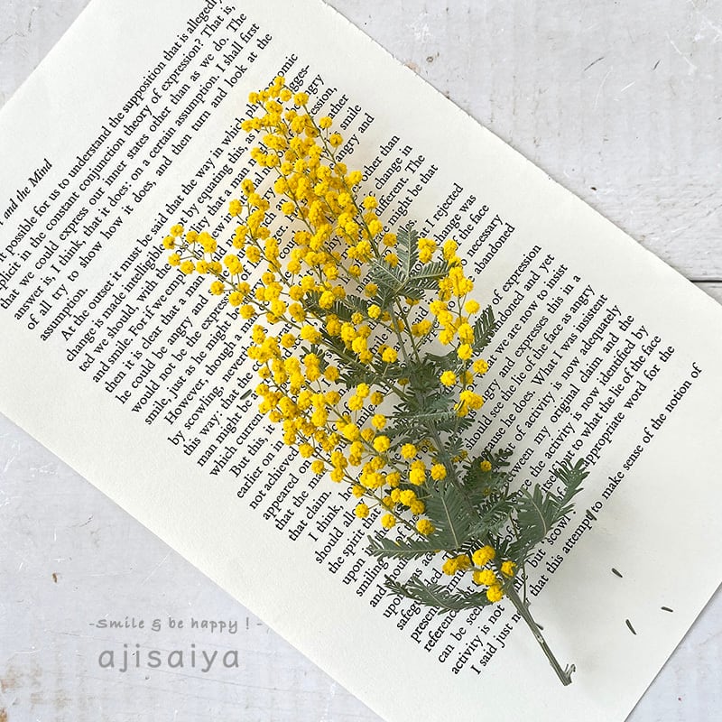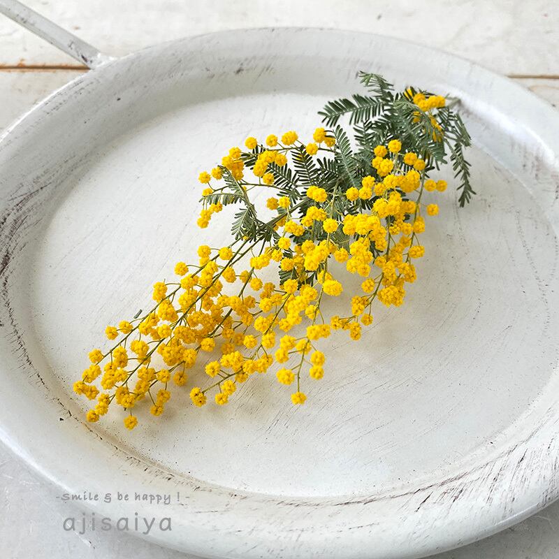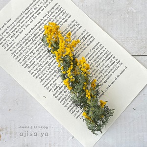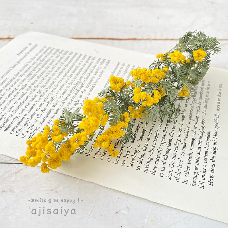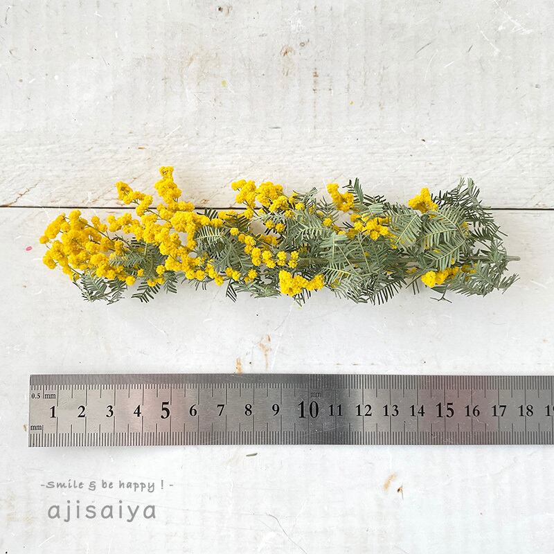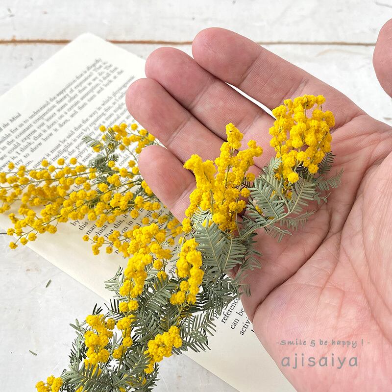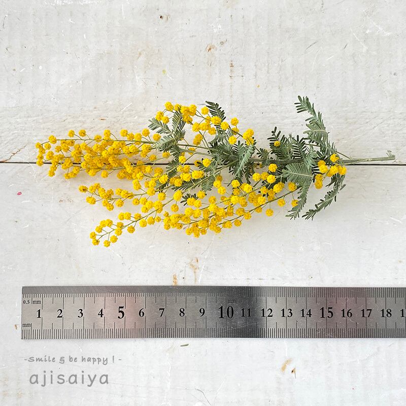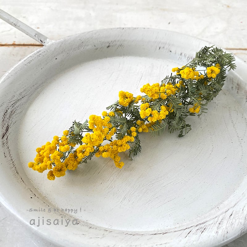 国産のミモザ(銀葉アカシア)は、ドライフラワーになると、小ぶりのものが多いです。色味も、輸入物にくらべ、黄色味がつよいですね。レモンイエローのような黄色です。