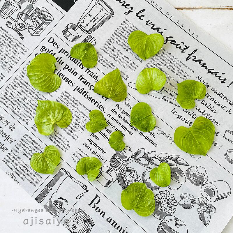 さわやかな、ライムグリーンに染めており、放射状にのびる葉脈もしっかり見えるので、作り物感もなく、かわいらしいアイテムとしてご利用いただけます。